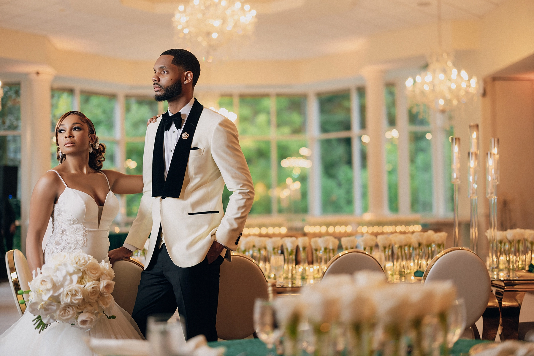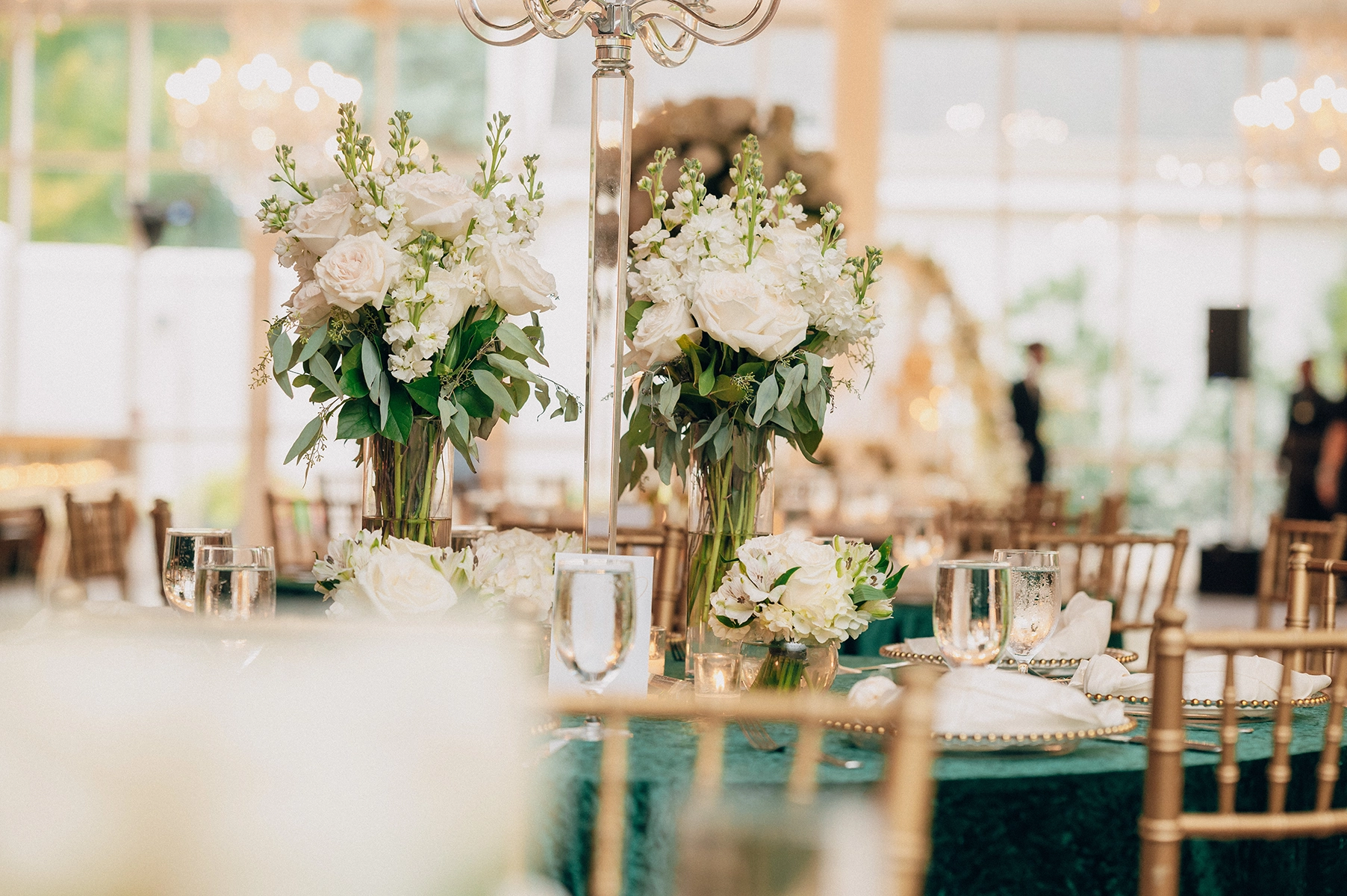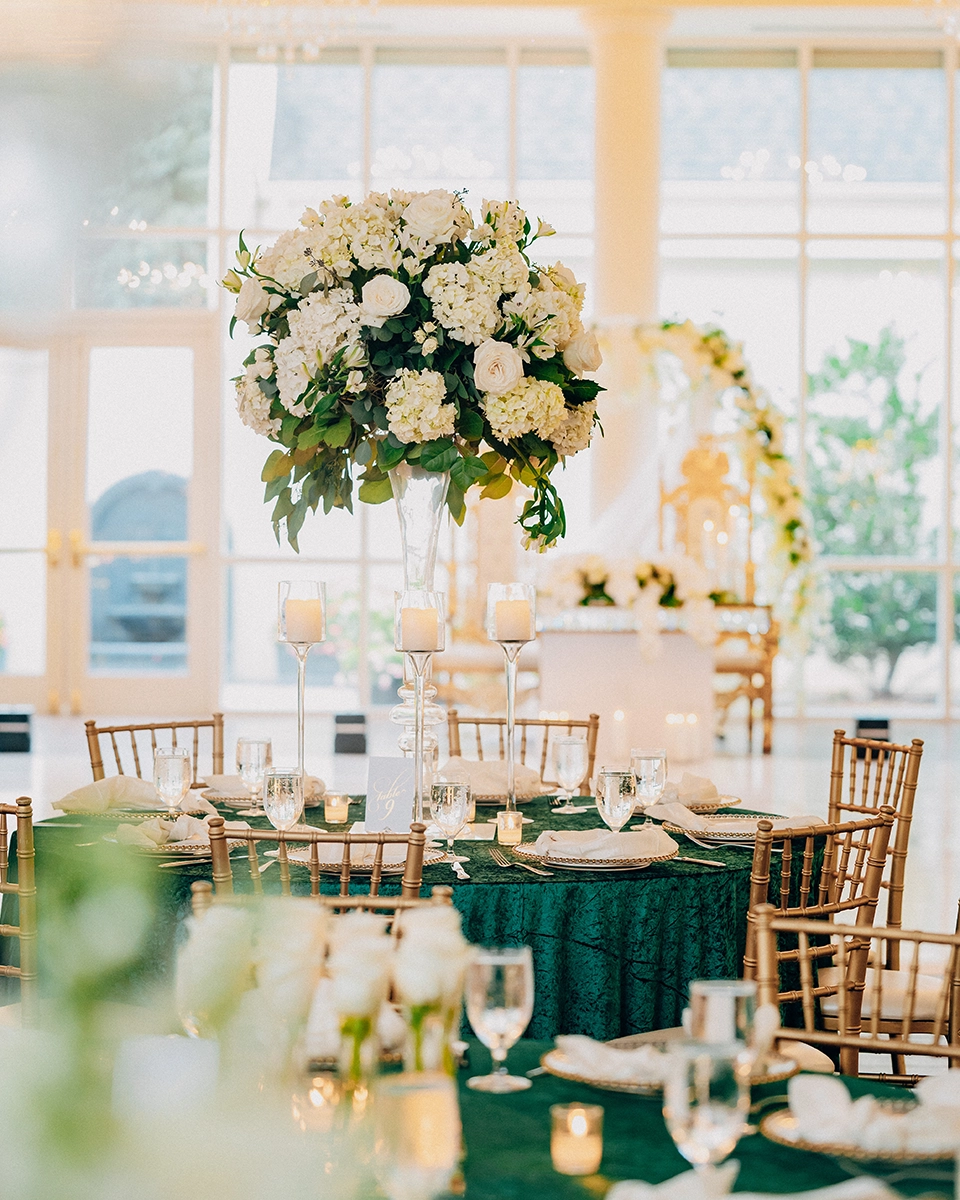 For the reception, the ballroom was transformed into a grand, impactful design with a unique floor plan featuring a mix of square tables, long estate tables, and mirrored tops. Each table design brought its own wow factor: serpentine tables lined with over 100 white rose bud vases and glowing votives in an elegant “S” shape, estate tables dressed in hunter green velvet and topped with soaring candelabras, and mirrored tables that reflected candlelight for a luxe, modern effect.