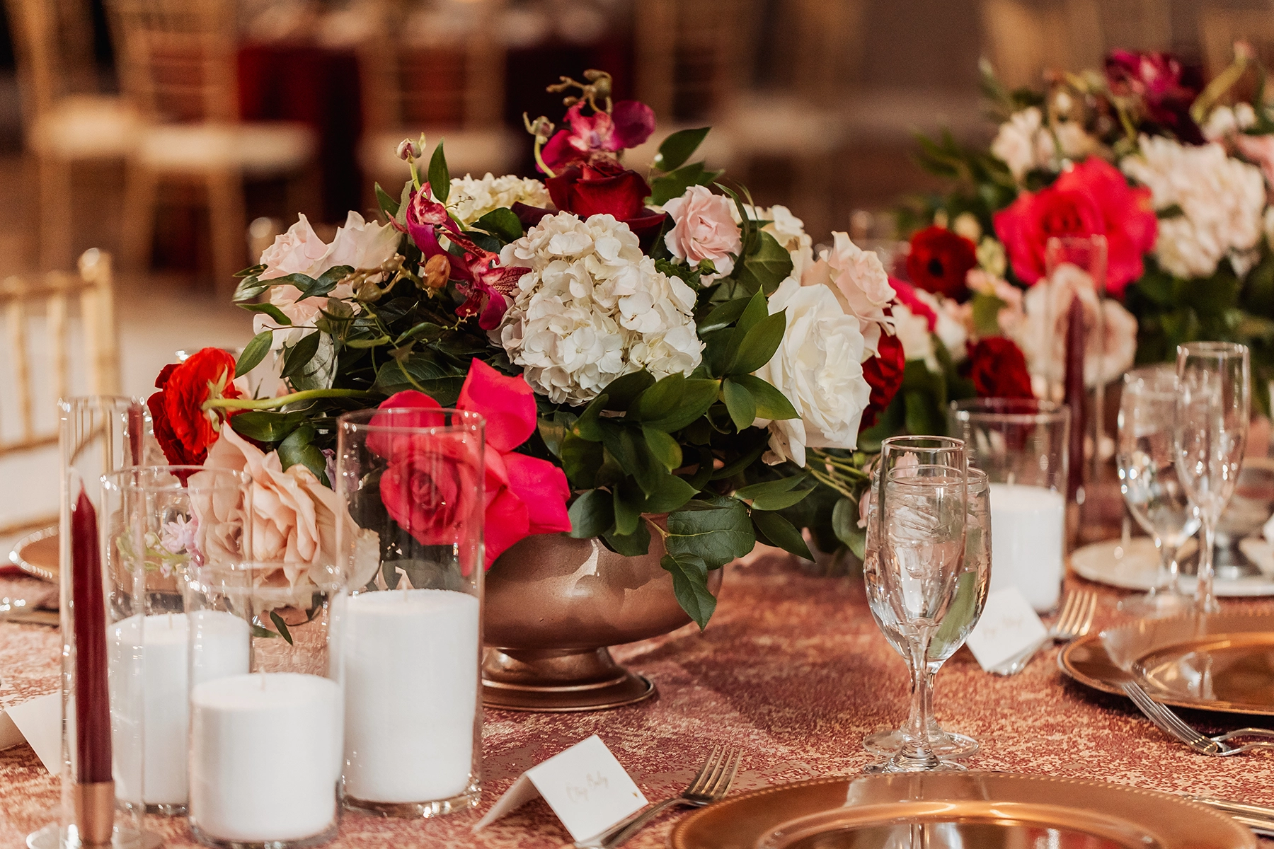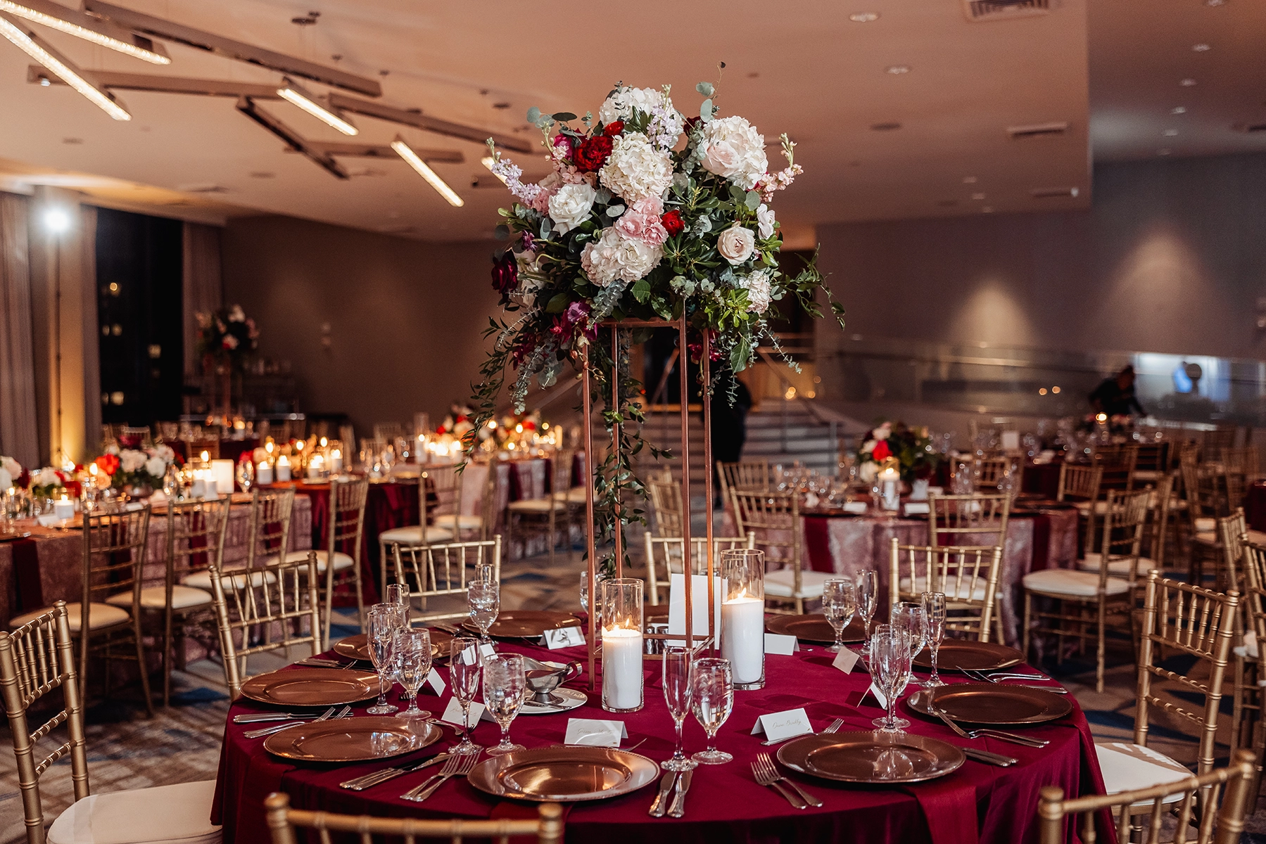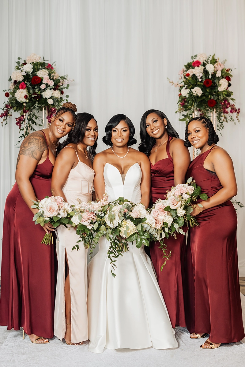 Taking place the weekend after Thanksgiving, the design featured rich shades of burgundy, blush, and hot pink—an intentional detail chosen by the bride to honor her journey of strength and remission from breast cancer.