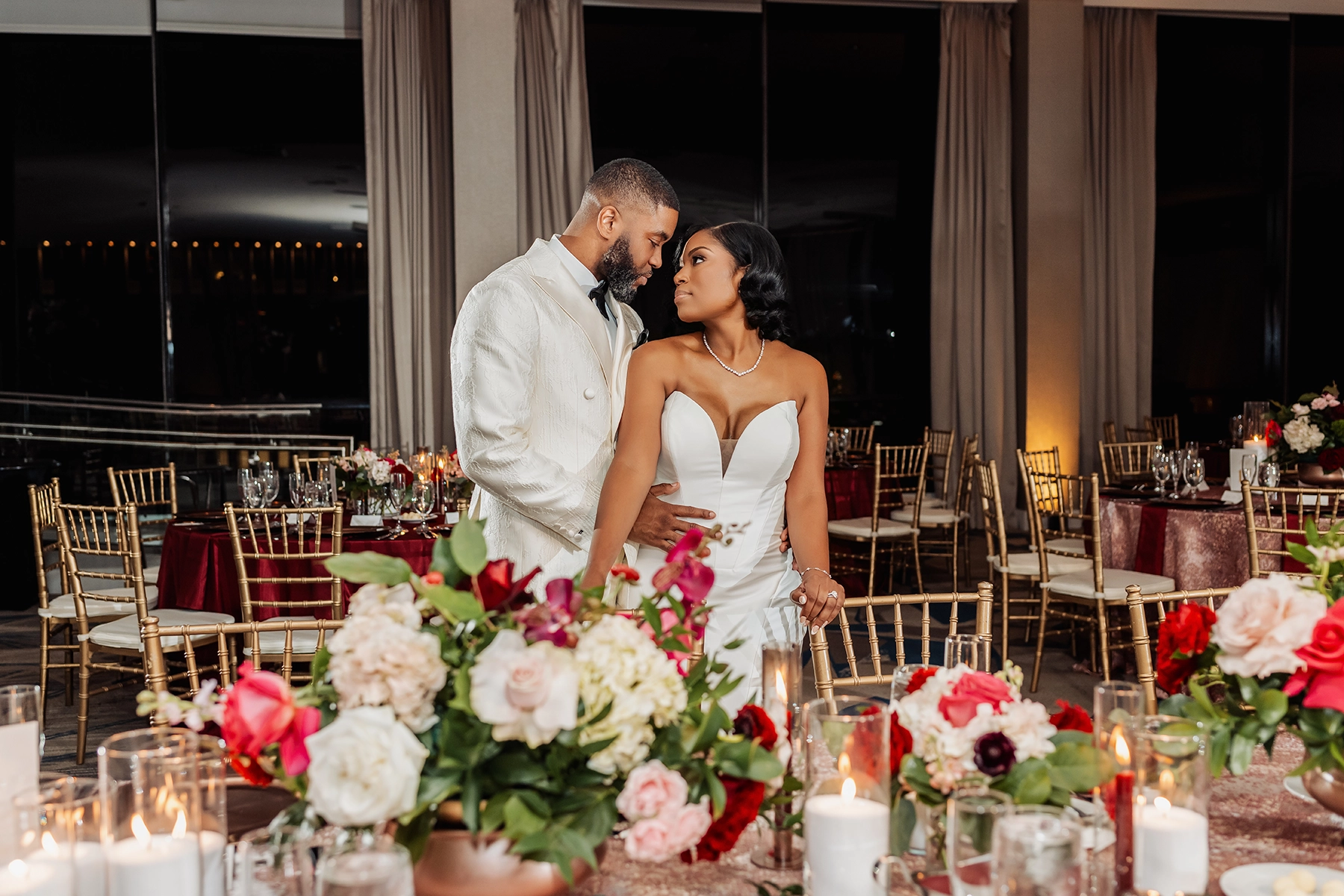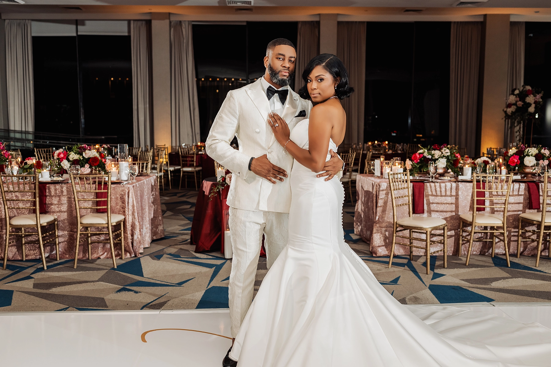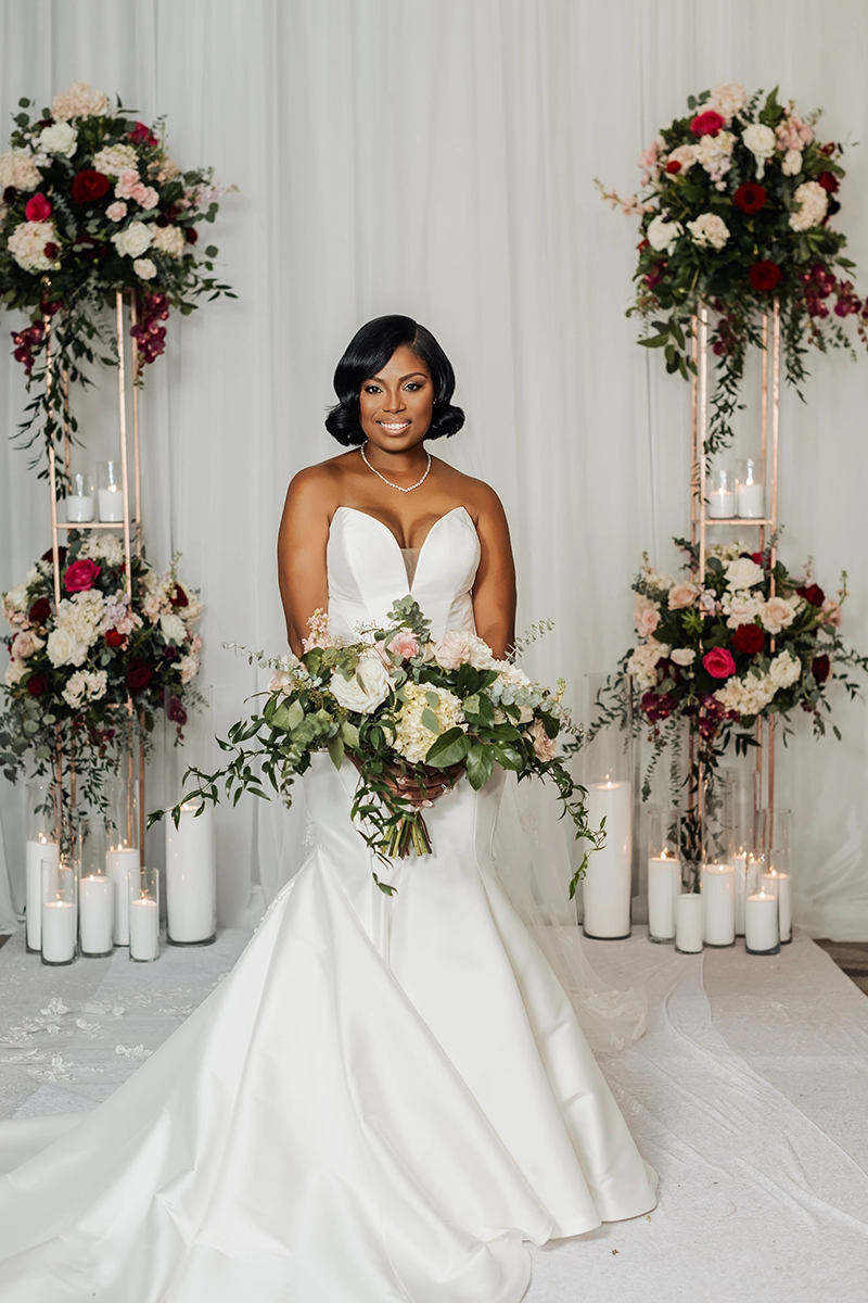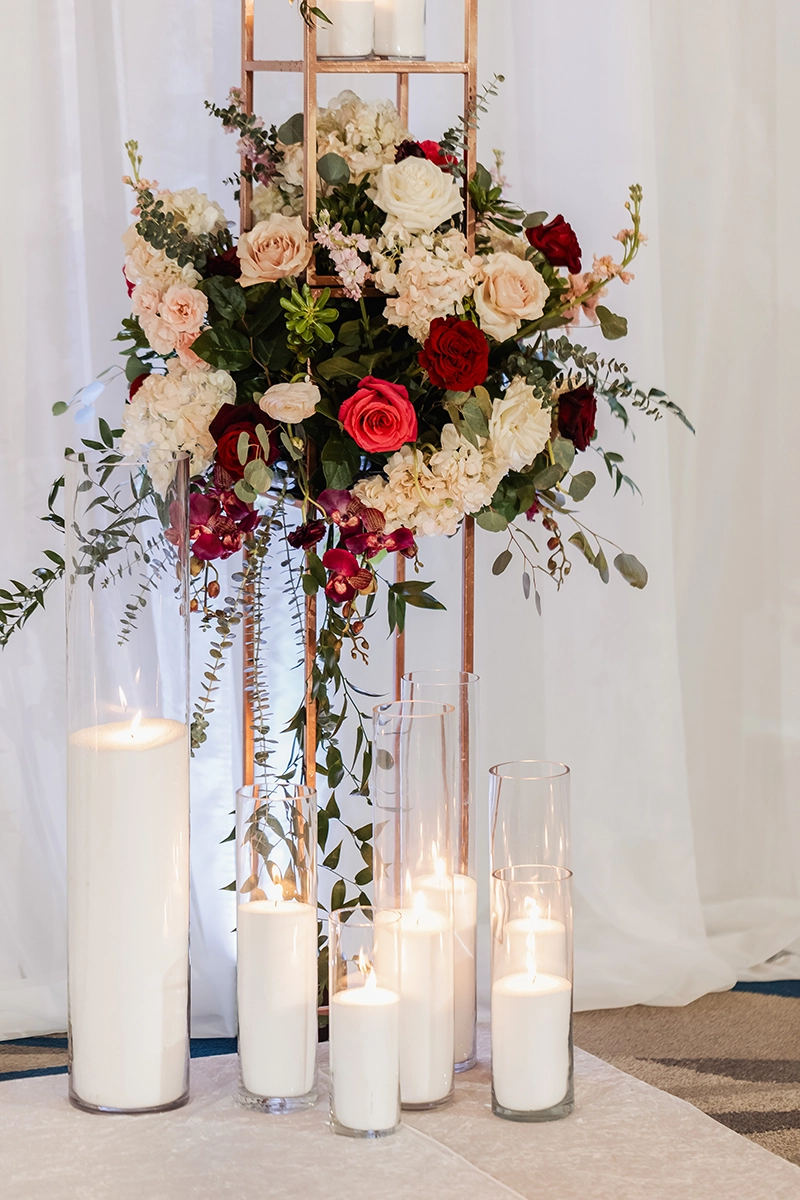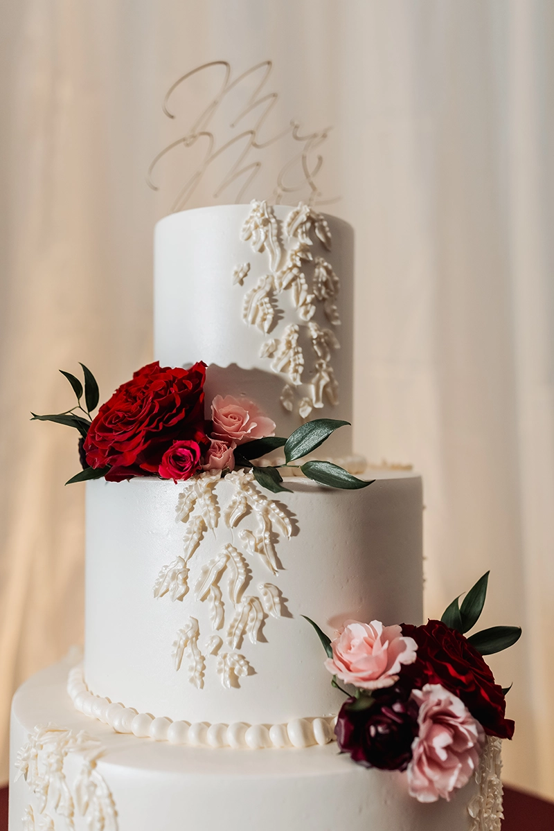 The ballroom was draped floor-to-ceiling in white, with a raised platform that created an elegant ceremony setting. For the reception, the couple was surrounded by loved ones at estate tables styled with textured burgundy linens, lush low centerpieces, and a soft glow from white and burgundy taper candles. At the heart of the celebration, the sweetheart table and cake display became striking focal points, blending romance with impact.