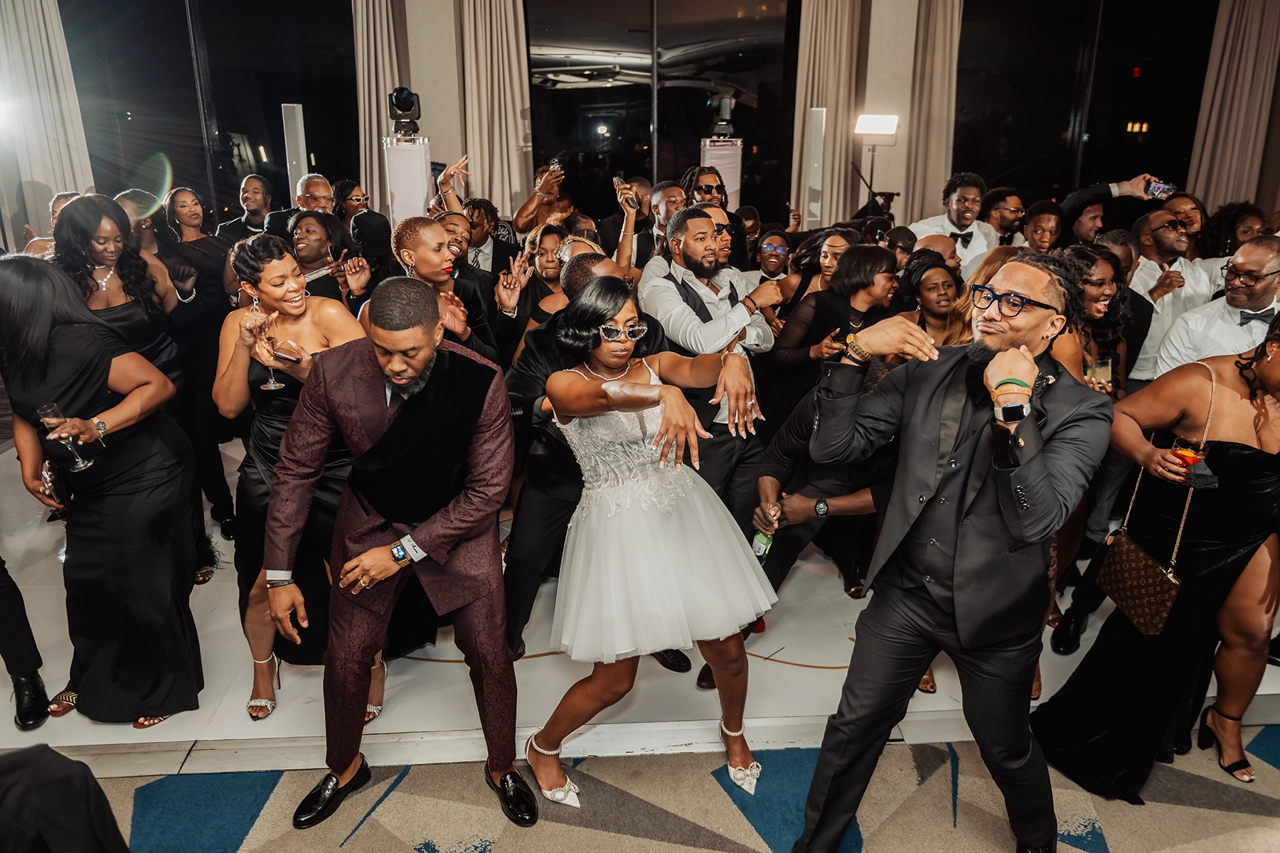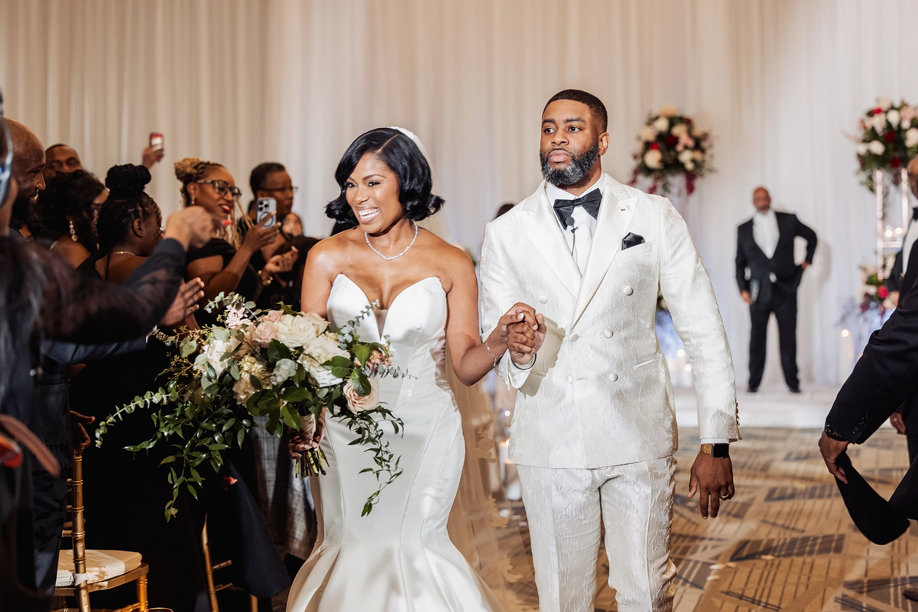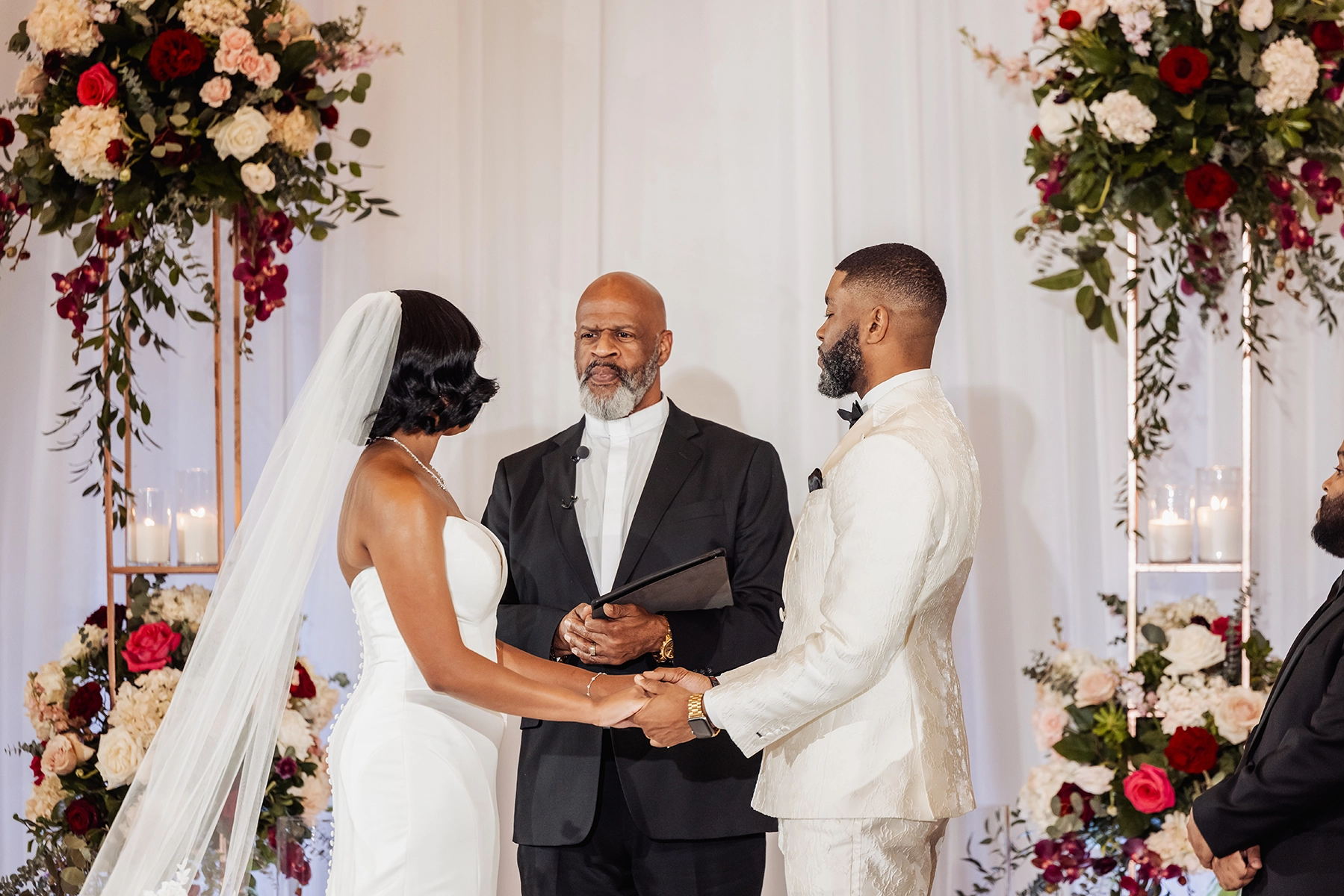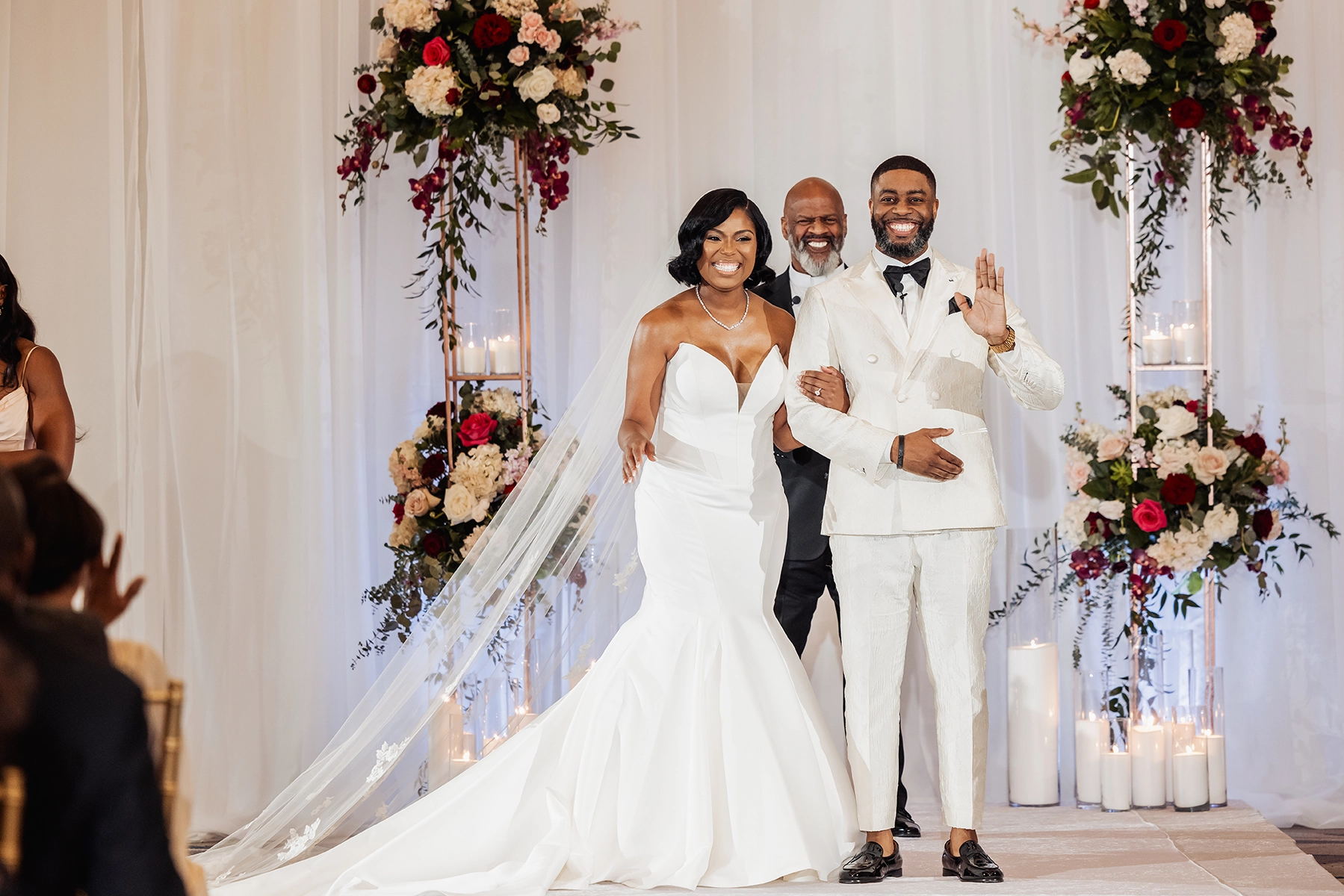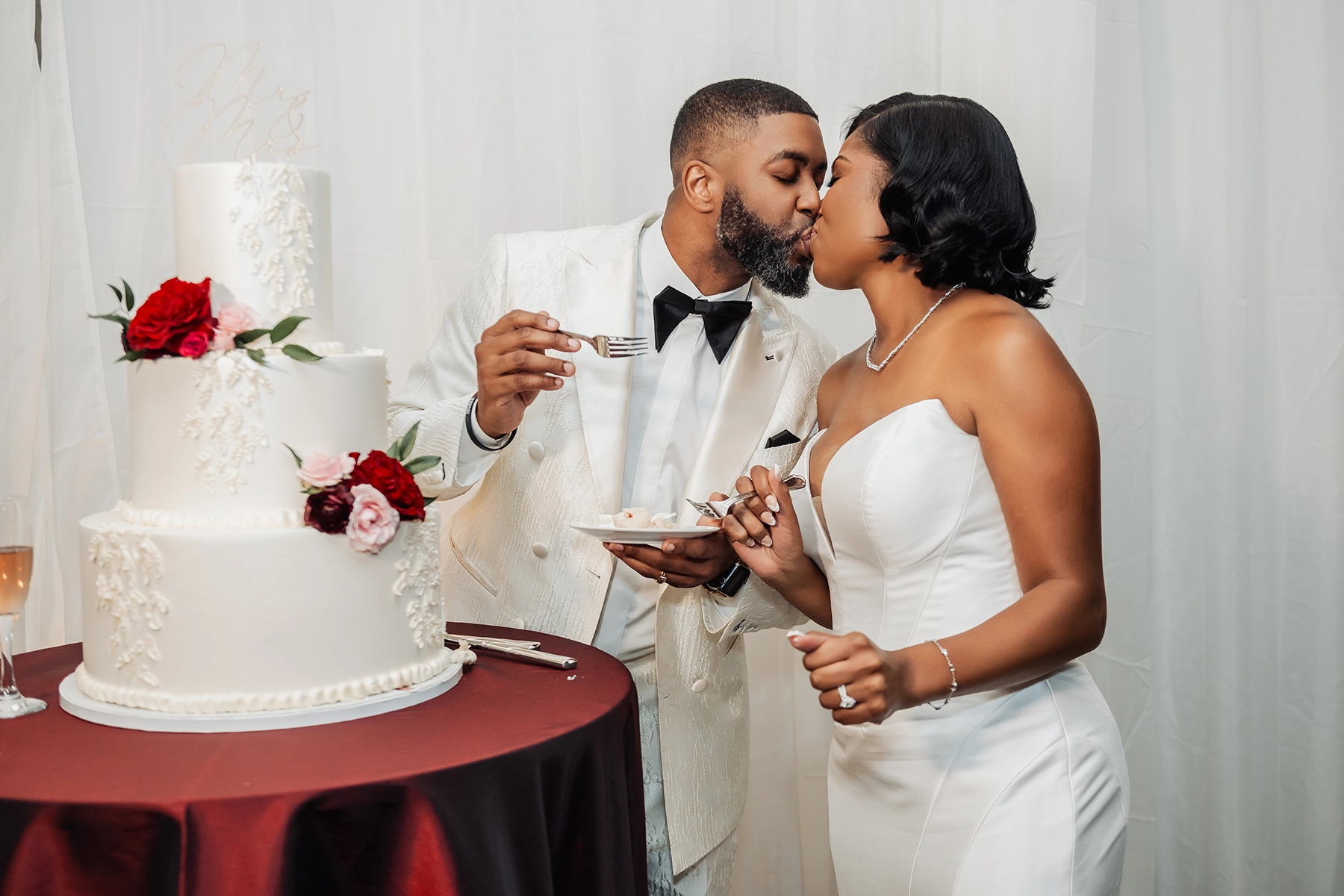 The ballroom was draped floor-to-ceiling in white, with a raised platform that created an elegant ceremony setting. For the reception, the couple was surrounded by loved ones at estate tables styled with textured burgundy linens, lush low centerpieces, and a soft glow from white and burgundy taper candles. At the heart of the celebration, the sweetheart table and cake display became striking focal points, blending romance with impact.