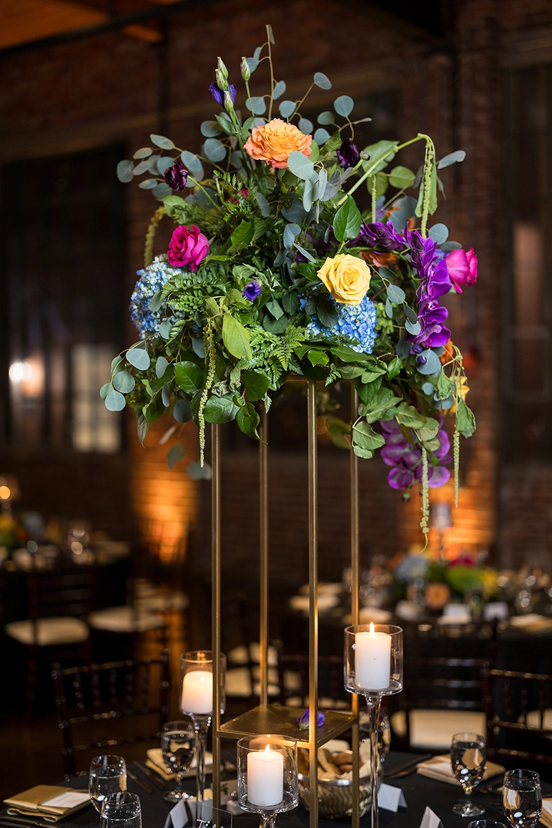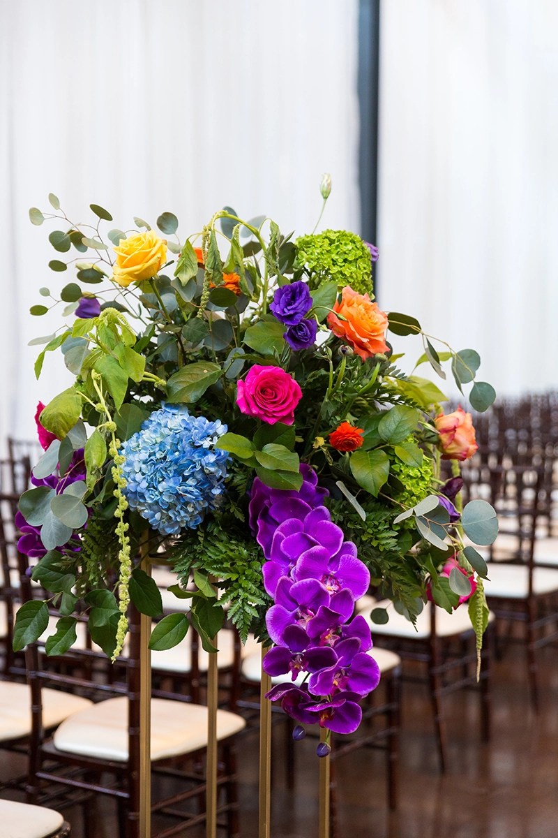 Cherae envisioned a design that felt vibrant, joyful, and full of character. The floral palette was electric with yellow, orange, and hot pink roses, fuchsia orchids, blue and green hydrangeas, pampas grass, and hanging amaranthus that dripped like poetry from above.