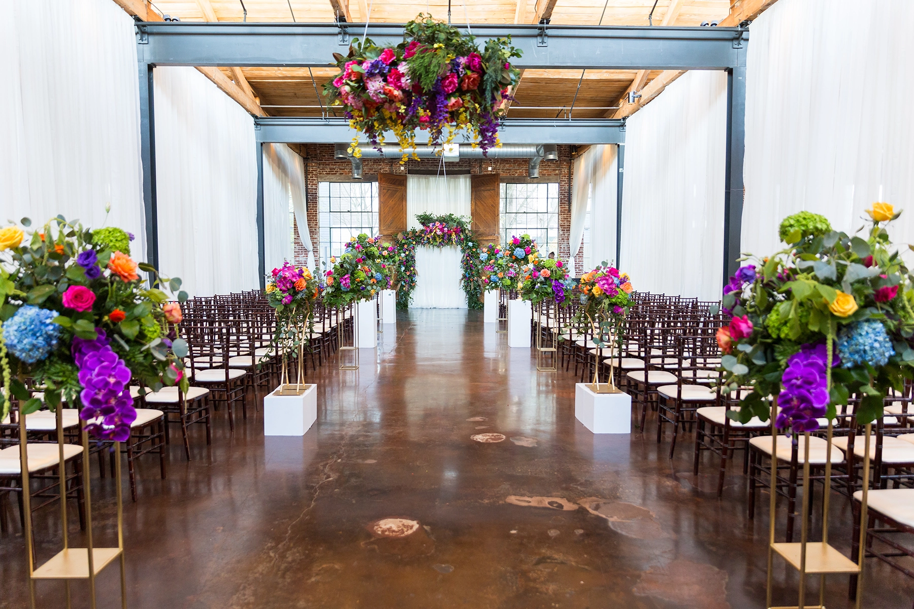 The Foundry at Puritan Mills was the perfect canvas for their 300-guest celebration, a historic industrial space with brick walls, large windows, and just enough texture to feel timeless. The venue’s ivory draping allowed us to divide the space into three distinct areas: ceremony, cocktail hour, and reception.