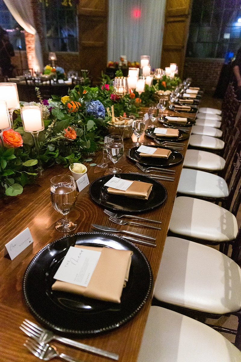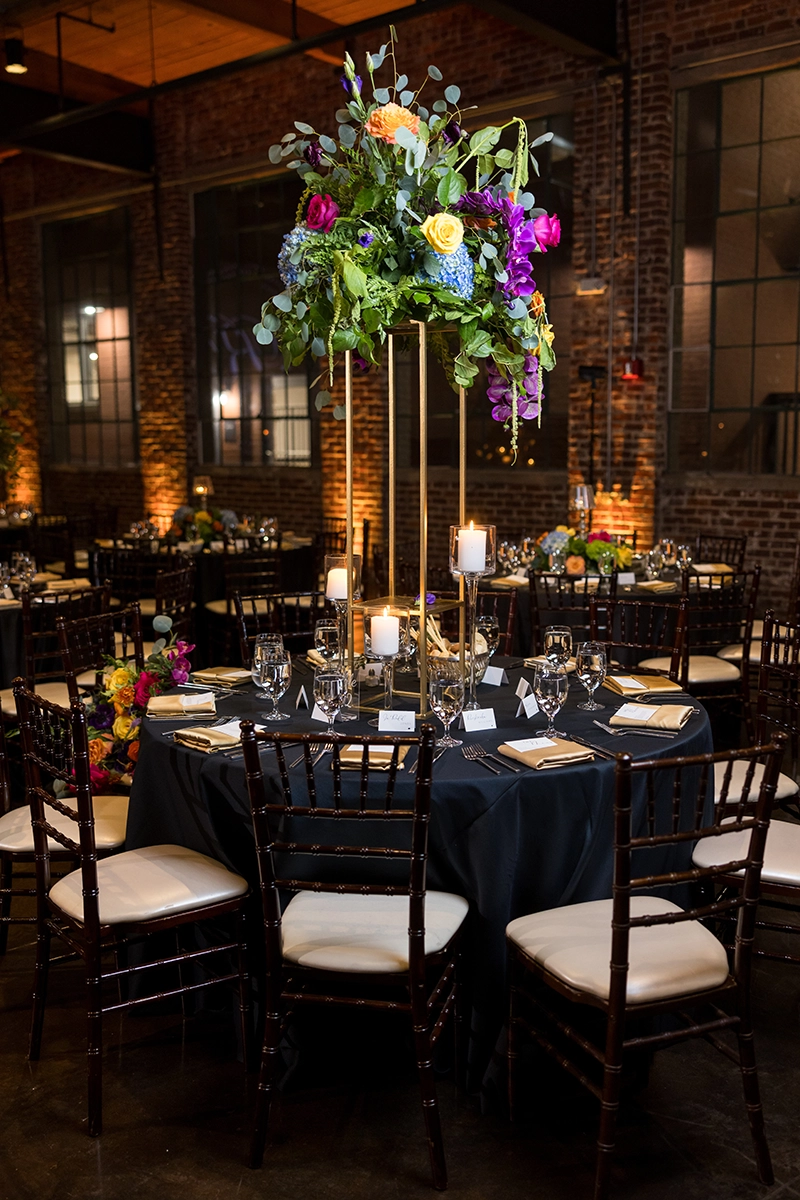 The reception design brought everything together with black satin and dupioni linens, gold napkins (a nod to John’s Alpha Phi Alpha pride), and rich mahogany chairs that grounded the room. The bright florals pulled the entire look into harmony. My favorite design moment was the hanging floral chandeliers paired with tall lampshade candelabras that cast the most romantic glow across the tables.